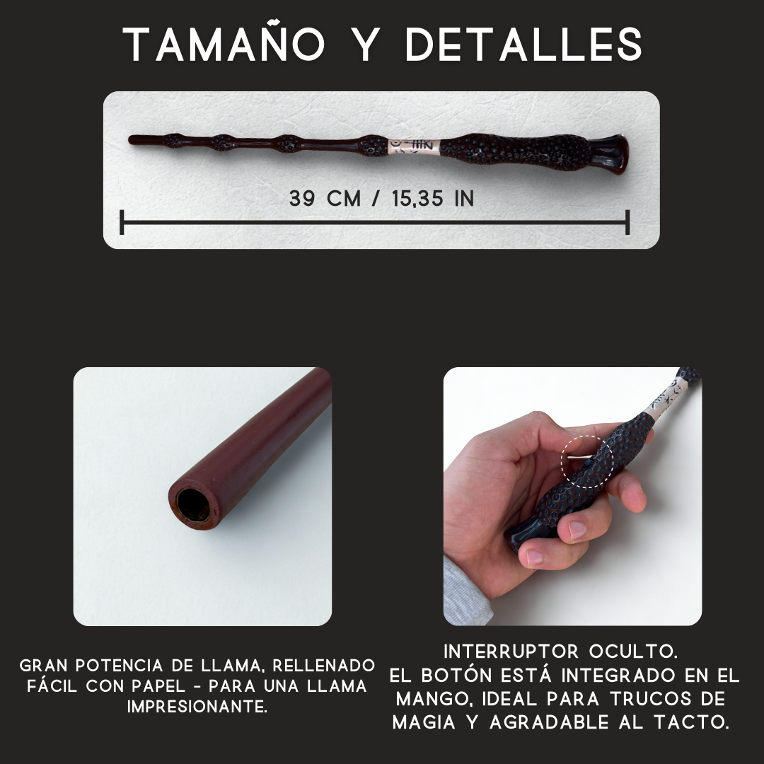 El proceso es muy sencillo: primero se corta el papel mágico, luego se arruga ligeramente, después se introduce en la varita y, por último, se enciende y se activa para que la llama aparezca y la magia cobre vida.
